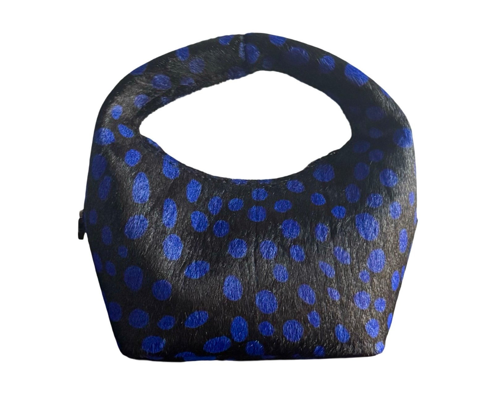 - Exterior: pouch shaped , leather twined in chain strap, side rings for detachable straps , zip for closure .