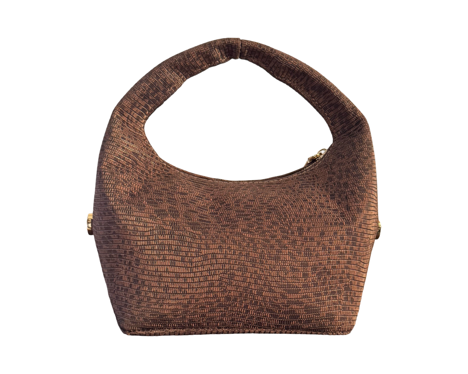• Exterior: pouch shaped , leather twined in chain strap, side rings for detachable straps , zip for closure .
