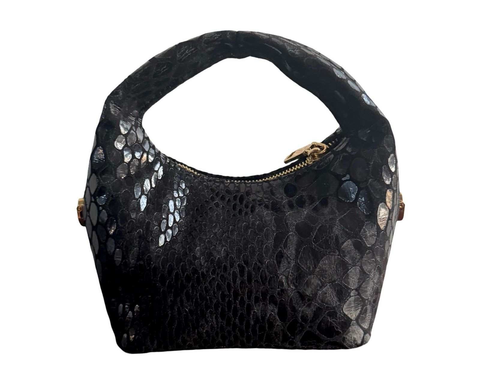 - Exterior: pouch shaped , leather twined in chain strap, side rings for detachable straps , zip for closure .