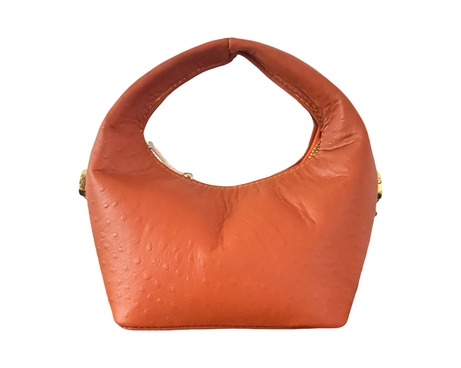 - Exterior: pouch shaped , leather twined in chain strap, side rings for detachable straps , zip for closure .